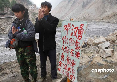 5月17日上午,在四川省汶川大地震中幸存的49歲映秀鎮頭道村農民鄧云祥和女兒鄧小琴,在通往家鄉的必經之地插上告示牌,企望失蹤的兒子鄧漢勇能夠平安歸來。任晨鳴 攝