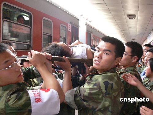 5月21日早7時許,一列運送四川地震傷員的專列徐徐駛入西安客運站,早已等待就緒的醫務人員馬上將傷員轉送至醫院接受治療。據了解,這列運送傷員的專列是20日下午4時從四川綿陽發車的,車上共有傷員248人,車上解放軍第四軍醫大學專門抽調了30余名醫務人員全程陪護,到達西安客運站后,傷員將被救護車全部接到第四軍醫大學附屬醫院西安西京醫院和唐都醫院接收治療,目前西京醫院已經提前準備了500張床位以收治更多的地震傷員。中新社發 楊志濤 攝