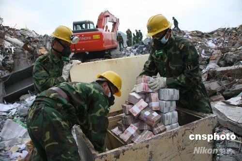 四川北川國家金庫庫款被成功挖掘出。中新社發 陳雙維 攝