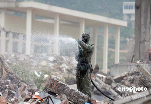 防化兵在對北川中學(xué)教學(xué)樓廢墟重點消毒。