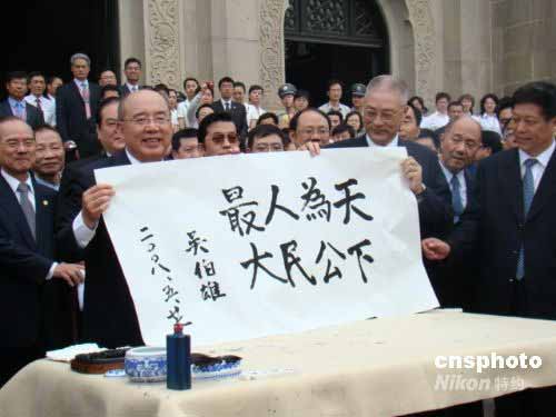 中國國民黨主席吳伯雄率領(lǐng)的大陸訪問團(tuán)拜謁中山陵,并題字“天下為公 人民最大”。中新社發(fā) 丁梅 攝