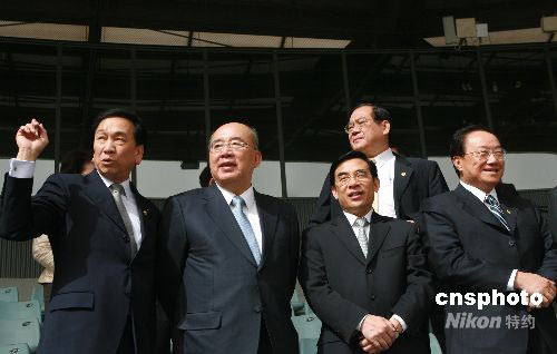 5月28日,中國國民黨主席吳伯雄一行前往北京五棵松棒球場參觀北京奧運會棒球場地。中新社發 廖文靜 攝