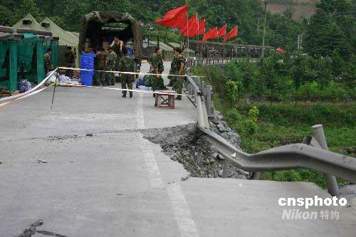 “5.12”四川汶川大地震中,彭州小魚洞大橋被震斷,已不能通行。圖為5月28日,濟南軍區官兵在大橋兩側警戒。中新社發 楊杰 攝