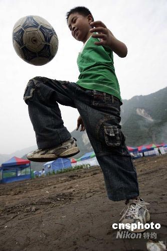 圖:什邡紅白鎮災區的男孩在空地上踢球