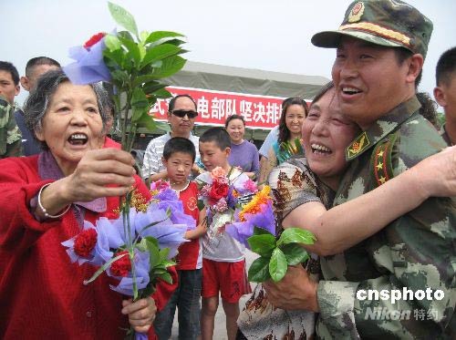 6月1日,許多綿陽市民自發(fā)前往南郊機場歡迎參加唐家山堰塞湖搶險的武警官兵,并為他們獻花、送水。從5月31日起,參加唐家山堰塞湖搶險的武警官兵陸續(xù)乘機返回綿陽市。中新社發(fā) 肖青 攝