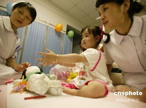 “小馨懿”來了!這個曾被四川北川廢墟壓了40多個小時,溫總理為她讓路、江蘇省醫生為她截肢的3歲女孩,頑強地昭示著人間的愛與感動。5月31日晚,她乘飛機抵達南京,入住江蘇省人民醫院,繼續接受治療。中新社發 吳俊 攝