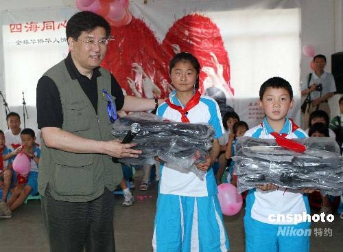 中國新聞社副總編輯章新新向災(zāi)區(qū)兒童贈送書包等學(xué)習(xí)用具。中新社發(fā) 毛建軍 攝