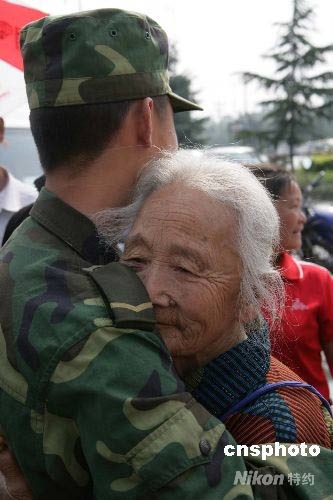 5月31日上午9時(shí),在四川都江堰市海蓉藥業(yè)公司門口,濟(jì)南軍區(qū)某工兵團(tuán)的43名都江堰籍抗災(zāi)官兵在部隊(duì)轉(zhuǎn)場(chǎng)之際與他們的親人做30分鐘的短暫團(tuán)聚。