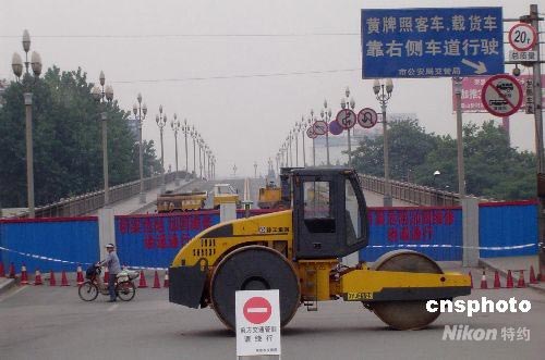 6月2日凌晨三時,因小商品攤位發生火災導致南京長江大橋南引橋第一橋孔嚴重受損,大橋實行交通管制,除公交車及小型客車可繞行上橋外,其他車輛二十四小時禁止通行。受此影響,當日南京碼頭輪渡運送過江乘客達十萬人以上。圖為南京長江大橋南引橋設置的禁止交通圍檔。中新社發 王國安 攝