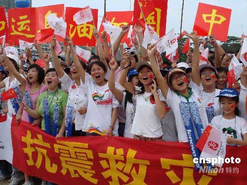 當地民眾舉著國旗和奧運五環旗,高喊“中國加油”、“四川加油”。中新社發 黃艷梅 攝