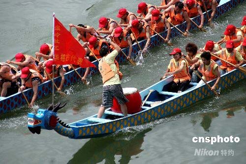 六月八日上午,在福建武夷山城中的崇陽溪上,兩只龍舟你追我趕。當天是中國傳統節日端午節,福建武夷山舉辦民俗活動龍舟賽迎接節日到來。中新社發 周文杰 攝