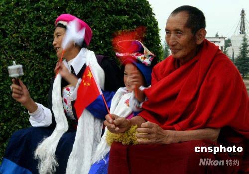 在云南民族村里一名喇嘛和兩名藏族同胞一起等待圣火到來。 中新社發 廖攀 攝