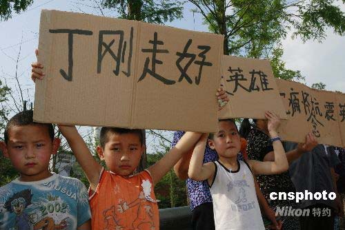 6月9日下午,四川省遂寧市數千群眾自發來到烈士陵園公墓,送別遂寧市優秀的抗震救災英雄丁剛。今年40歲的丁剛,是遂寧市船山區一名普通居民,6月3日參加遂寧市應急民兵營一連突擊隊,赴災區抗震救災。5日18時30分許在映秀鎮搜尋失事直升飛機時,遇山體滑坡,為救戰友,被飛石擊中頭部,不幸犧牲。6月9日下午3點30分,遂寧市政府、遂寧軍分區為丁剛同志舉行遺體告別儀式,以告慰英靈。中新社發 鐘 敏 攝