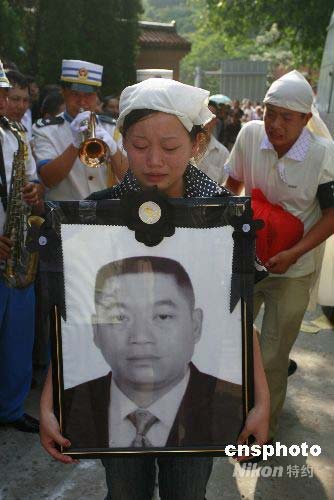 丁剛的女兒捧著父親的遺相含淚走過送別的人群。 中新社發 鐘 敏 攝