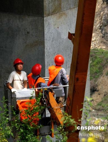 勘測人員查看四川震區(qū)橋梁受損情況