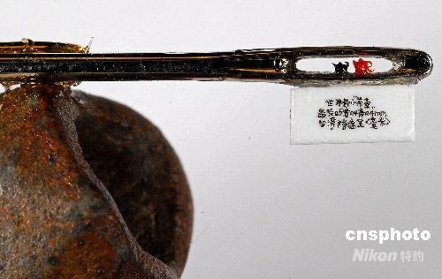 6月13日,臺(tái)灣著名微雕家陳逢顯攜其“世界最小茶壺”系列來北京進(jìn)行文化訪問。圖為陳逢顯用黑翡翠和紅翡翠石粉末雕刻的世界最小茶壺,置于針孔中。中新社發(fā) 陳立宇 攝
