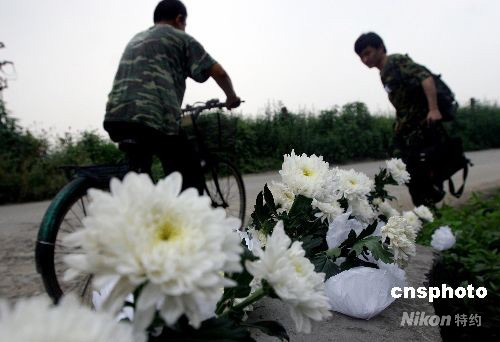 6月13日,在進入成都鳳凰山機場的道路上,附近民眾自發在路邊擺設白花,悼念失事直升機遇難機組人員。中新社發 劉新 攝