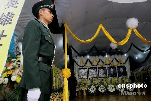 6月13日,成都軍區陸航團在鳳凰山機場搭設靈堂,悼念在汶川大地震救災行動中失事直升機上5位遇難機機組人員。中新社發 劉新 攝