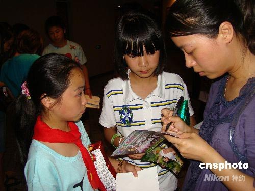 孩子們讓在陽光活動中一直陪伴的阿姨簽名。中新社發 付美斌 攝