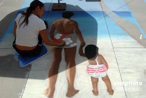一名畫家正在創作粉筆畫《看!。中新社發 張煒 攝