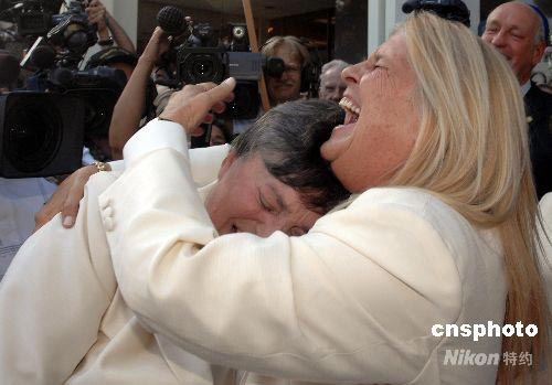 女同性戀者羅賓·泰勒(左)和戴安·奧爾森(右),正式在洛杉磯縣政府大樓門前登記結婚。中新社發 張煒 攝