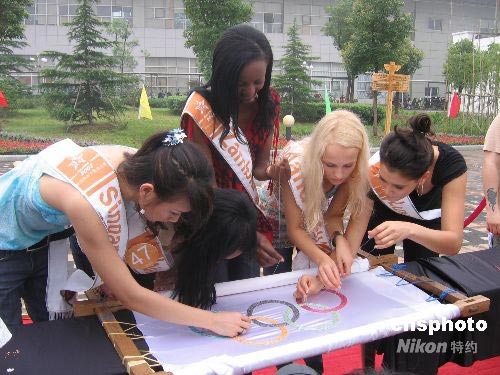 圖:世界休閑佳麗手串珍珠共制奧運五環旗(2)