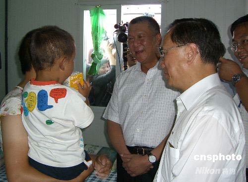 6月28日上午,香港特別行政區(qū)行政長官曾蔭權、澳門特別行政區(qū)行政長官何厚鏵一行來到彭州市小漁洞鎮(zhèn)江橋村大楠社區(qū)安置點,慰問當地受災群眾,了解抗震救災情況。中新社發(fā) 郭嘉農 攝