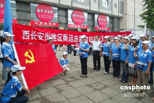 7月1日,中國共產黨成立87周年,黨員志愿者在黨旗下宣誓,將為北京奧運會的成功舉辦奉獻自己的力量。中新社發 富田 攝