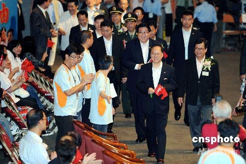 七月一日,香港回歸祖國十一周年紀(jì)念日,香港各界慶典委員會在香港體育館舉行盛大綜合文藝匯演,表達對汶川大地震災(zāi)后重建、慶祝香港回歸及北京奧運的支持。特區(qū)行政長官曾蔭權(quán)、中聯(lián)辦主任高祀仁等嘉賓出席,并與現(xiàn)場數(shù)萬觀眾共同歡慶。中新社發(fā) 洪少葵 攝