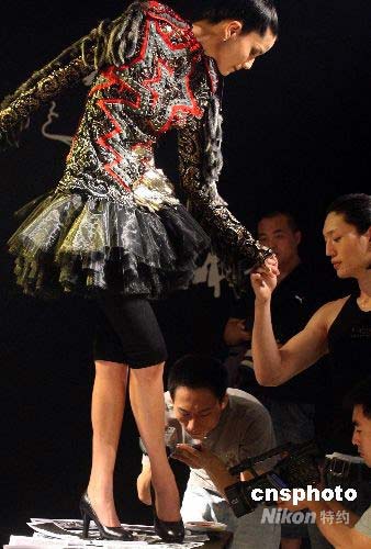 7月1日晚,“北京凱萊希模特學校2008年畢業匯報表演”在北京舉行。來自美國芝加哥大學博士Angela Zito編導創意的高跟鞋藝術秀別具特色,13位女模特,在中國傳統文士的書桌上表演走,坐,躺。男同學的加入令高跟鞋展現出男性和女性之間糾結的關系。名模陳娟紅最后登上書桌,穿上一雙鞋跟已經被刻上圖章的高跟鞋,把圖章蓋在由這次活動參與人員提供的照片上。這些照片代表著人們愿意重新體味過去的生活情景,該怎樣面對記憶,是把他們扔在一邊塵“封”,還是不斷地重新“開”啟,探究著占有的象征,在現世和回憶之間的重新定位。圖為名模陳娟紅書桌上展示高跟鞋藝術秀。中新社發 錢興強 攝