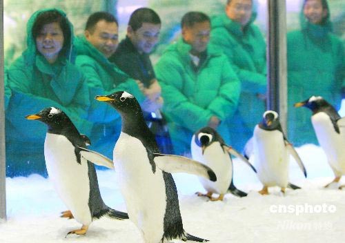 2008年7月3日凌晨,6只(3雌3雄)年齡分別為6至8歲的南極白眉企鵝從大連圣亞極地世界首次出遠門,乘坐飛機抵達蘇州市高新區白馬澗生態園,應邀參加以“極地科普、呼吁環保”為主題的“2008蘇州白馬澗冰雪狂歡飲料節”助游展演活動。該活動自7月5日起在該市舉行為期兩周。中新社發 蘇秀 攝