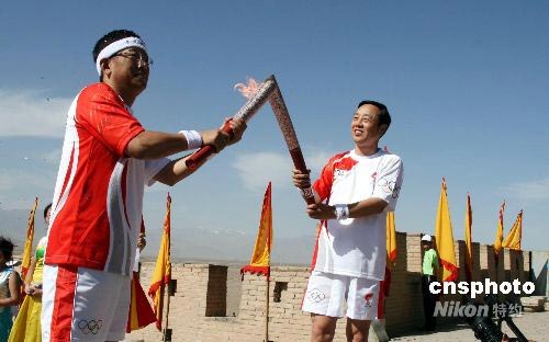 第203棒火炬手楊壯(左)和第204棒火炬手、甘肅省副省長郝遠在“天下第一雄關”的城樓上交接火炬。 中新社發 周兆軍 攝