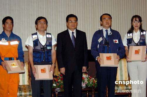 胡錦濤在札幌向日本國際救援隊醫療隊贈送禮品