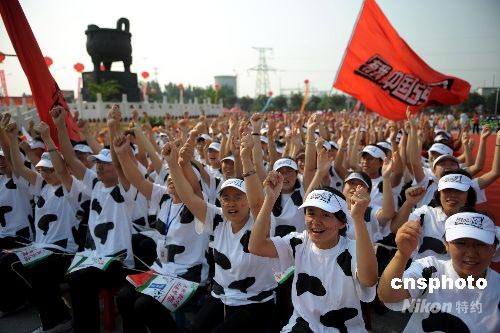 7月8日,奧運火炬在內蒙古呼和浩特市進行傳遞。在傳遞起點的民族團結寶鼎廣場,內蒙古民眾身穿花斑奶牛服裝迎接祥云火炬。中新社發 廖攀 攝