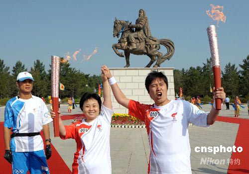 圖:奧運火炬在成吉思汗雕像前交接