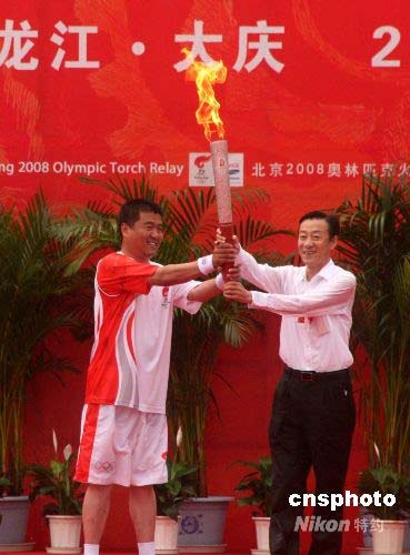 7月12日,北京奧運火炬在“石油之城”大慶傳遞,“鐵人鉆井隊”第19任隊長胡志強(左)從大慶市委書記韓學鍵手中接過第一棒火炬。 中新社發 周兆軍 攝