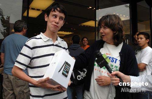 當(dāng)?shù)貢r(shí)間7月11日上午,上千名顧客在加州帕薩迪納市的一家蘋果專賣店排隊(duì)搶購新上市的3G版IPHONE手機(jī),首位買到手機(jī)的顧客palmigiano得意洋洋地展示“戰(zhàn)利品”。中新社發(fā) 張煒 攝