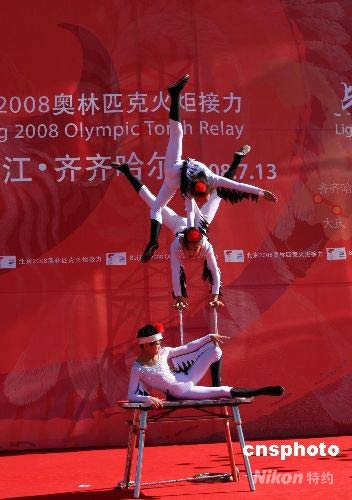 7月13日,北京奧運火炬在“丹頂鶴之鄉”齊齊哈爾傳遞,當地小雜技演員打扮成仙鶴模樣,亮出絕技迎接奧運火炬。 中新社發 周兆軍 攝