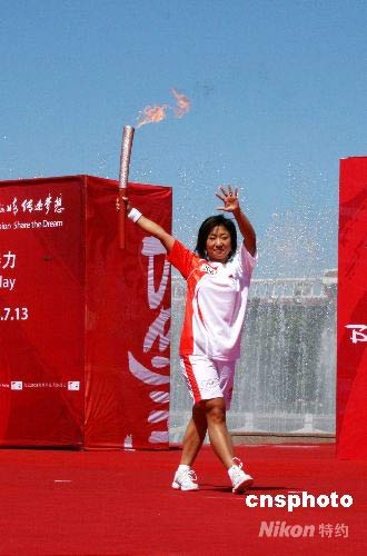 7月13日,北京奧運(yùn)火炬在齊齊哈爾傳遞,短道速滑世界冠軍付天余在自己的家鄉(xiāng)擔(dān)任最后一棒火炬手。 中新社發(fā) 周兆軍 攝