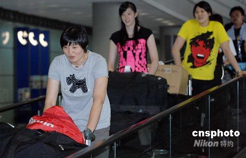 七月十四日中午,在剛剛結(jié)束的世界女排大獎賽中五戰(zhàn)四負(fù),最終僅位列第五的中國女排從日本返回北京。中新社發(fā) 陳文 攝