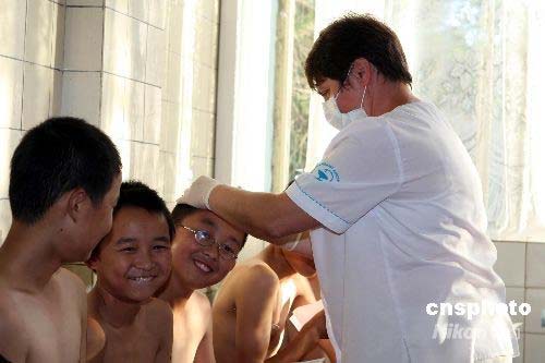 7月19日,184名來自中國四川地震災區兒童抵達黑海岸邊的全俄“雛鷹”兒童中心,進行三周康復療養。圖為兒童中心的醫生為這些初到的中國小客人檢查身體。中新社發 田冰 攝