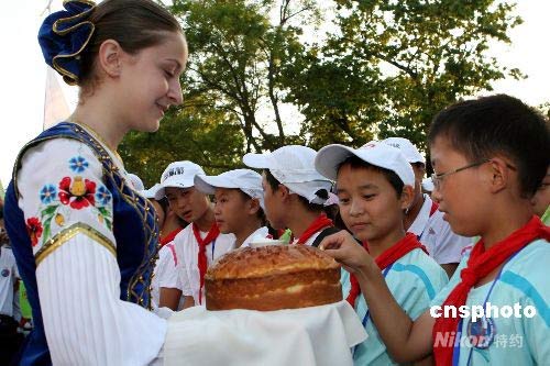 圖:俄羅斯傳統(tǒng)禮儀迎接中國(guó)地震災(zāi)區(qū)孩子