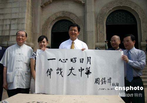 七月二十六日,臺(tái)北縣長(zhǎng)周錫瑋率臺(tái)北縣南京參訪團(tuán)一行十人拜謁南京中山陵,題字“一心昭日月,偉哉大中華”。周錫瑋一行二十五日晚間乘坐南京首航后的第四班兩岸周末包機(jī)抵達(dá)南京祿口國(guó)際機(jī)場(chǎng),開始為期五天的訪問行程。中新社發(fā) 朱曉穎 攝