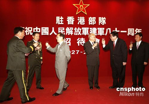 七月三十一日晚,為慶祝中國人民解放軍建軍八十一周年,并感謝特區政府和香港社會各界長期以來對駐軍的關心與支持,駐港部隊在中環軍營舉辦了“駐香港部隊慶祝中國人民解放八十一周年招待會”。全國政協副主席董建華、香港特區行政長官曾蔭權、中聯辦主任高祀任、外交部駐港特派員呂新華、駐港部隊司令員張少波少將、政治委員劉良凱中將等出席了此次招待會。中新社發 張勤 攝