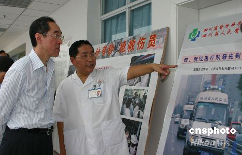 香港政務司司長唐英年率領特區政府代表團20余人,來到成都四川省醫院慰問地震中受傷的民眾。圖為唐英年觀看圖板了解醫院救治地震傷員情況。中新社發 霍潺 攝