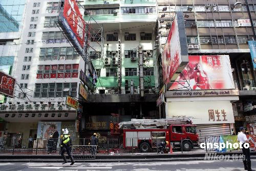 八月十日下午三時許,香港旺角嘉禾大廈的五級火警被救熄,此次大火中兩名消防員殉職,一名老婦死亡,另五十六人受傷。火警在當天九時許發生,焚燒了近六個小時。中新社發 洪少葵 攝