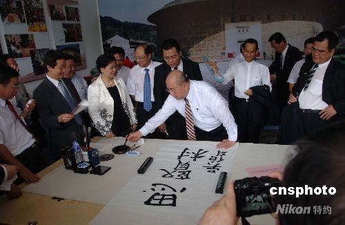 八月十四日,中國(guó)國(guó)民黨主席吳伯雄回到祖籍地--福建永定縣下洋鎮(zhèn)思賢村,在參觀(guān)思賢小學(xué)揮毫寫(xiě)下“思賢村”三個(gè)大字。當(dāng)天,吳伯雄夫婦時(shí)隔八年再度返鄉(xiāng)祭祖。中新社發(fā) 鄭祚聲 攝