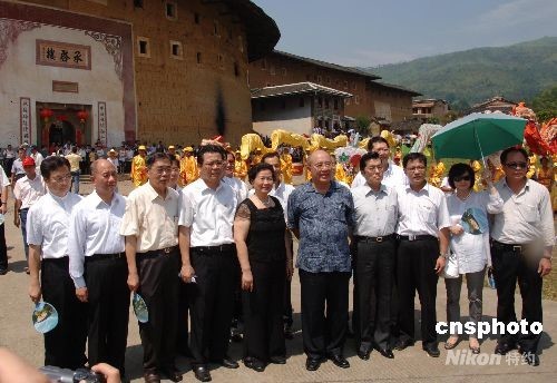 八月十四日下午,中國國民黨主席吳伯雄一行來到“土樓之鄉(xiāng)”福建永定縣的高北土樓群參觀游覽,在“土樓王”承啟樓前合影留念。中新社發(fā) 鄭祚聲 攝