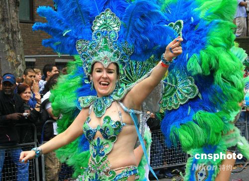 當地時間8月25日,歐洲最大規模的街頭文化藝術節——一年一度的英國諾丁山狂歡節在倫敦舉行。圖為盛裝游行隊伍在街頭巡游表演。中新社發 李鵬 攝