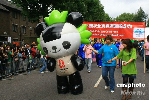 當地時間25日,歐洲最大規模的街頭文化藝術節——一年一度的英國諾丁山狂歡節在倫敦舉行。今年的狂歡節上,當地華人團體的盛裝隊伍打出“英國華人慶祝北京奧運圓滿成功”的橫幅,在福娃的帶領下走在狂歡節所有隊伍的最前面。